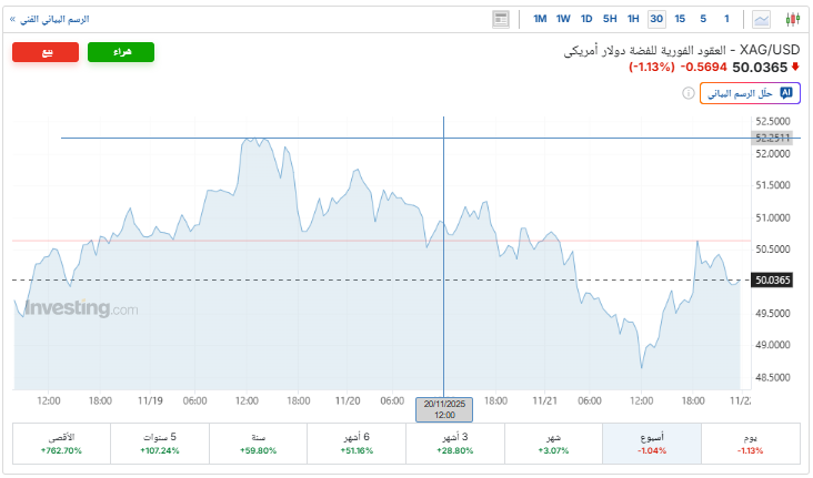 أما على الصعيد العالمي، اختتمت العقود الفورية للفضة جلسة تداولات الأسبوع بنسبة 1.1%، محققة خسارة أسبوعية بنسبة 1.04%، لتختتم الأسبوع عند المستوى 50.04 دولار للأوقية، وفقًا لـ«إنفستينج».