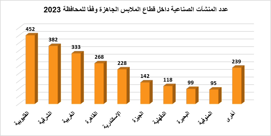 وتوضح هذه البيانات التركيز الجغرافي للصناعة في مناطق محددة، ما يعكس أهمية تلك المحافظات، كمراكز رئيسية للإنتاج في قطاع الملابس الجاهزة بمصر.