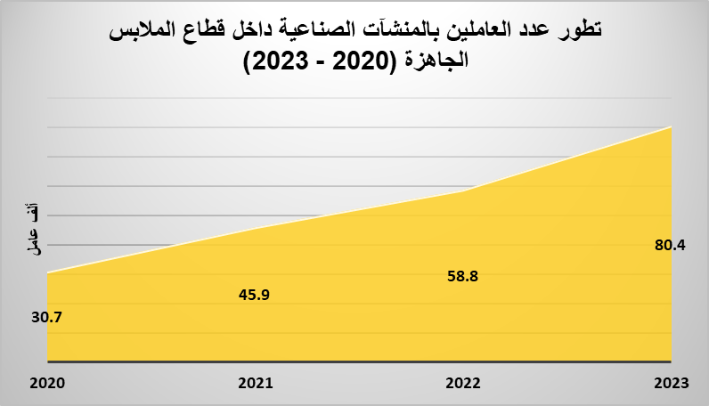 وسجلت عدد العاملين بالمنشآت الصناعية داخل قطاع الملابس الجاهزة 30.7 ألف عامل، ثم وصل إلى 45.9 ألف عامل في 2021، ثم تطور ليصل إلى 58.8 ألف عامل، مرورًا بعام 2023، والذي سجل عدد العمال 80.4 ألف عامل.