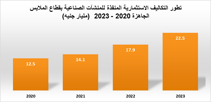 وتطورت التكاليف الاستثمارية المنفذة للمنشآت الصناعية بقطاع الملابس الجاهزة، حيث سجلت في 2020، ما يقرب من 12.5 مليار جنيه، مرورًا بعام 2021، والتي سجلت فيها 14.1 مليار جنيه، وفي عام 2022 سجلت التكاليف الاستثمارية 17.9 مليار جنيه، وصولًا لعام 2023 والذي سجلت التكاليف الاستثمارية المنفذة 22.5 مليار جنيه.