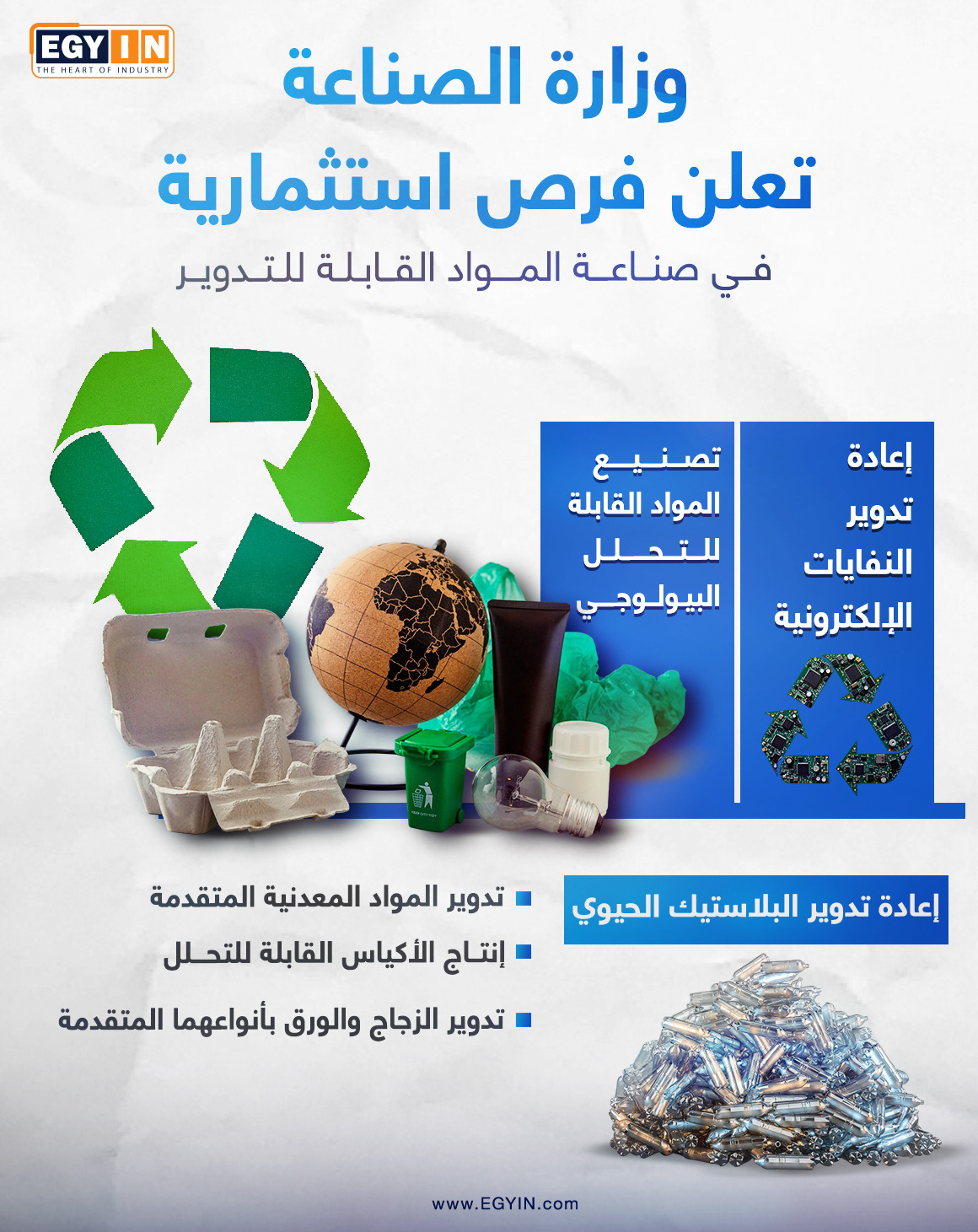 حددت وزارة الصناعة، مجموعة صناعات تمثل فرص استثمارية لتلبية احتياجات السوق وتقليل فاتورة الواردات، والتي كان من أبرزها الفرص الاستثمارية في صناعة المواد القابلة للتدوير.