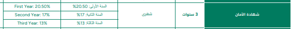 يتيح البنك شهادة الأمان للعملاء بأعلى عائد في مصر ويصرف لمدة 3 سنوات ويصرف شهريًا، ويصل العائد في السنة الأولي إلى 20.50%، وفي السنة الثانية يكون معدل العائد 17%، وفي السنة الثالثة 13%.