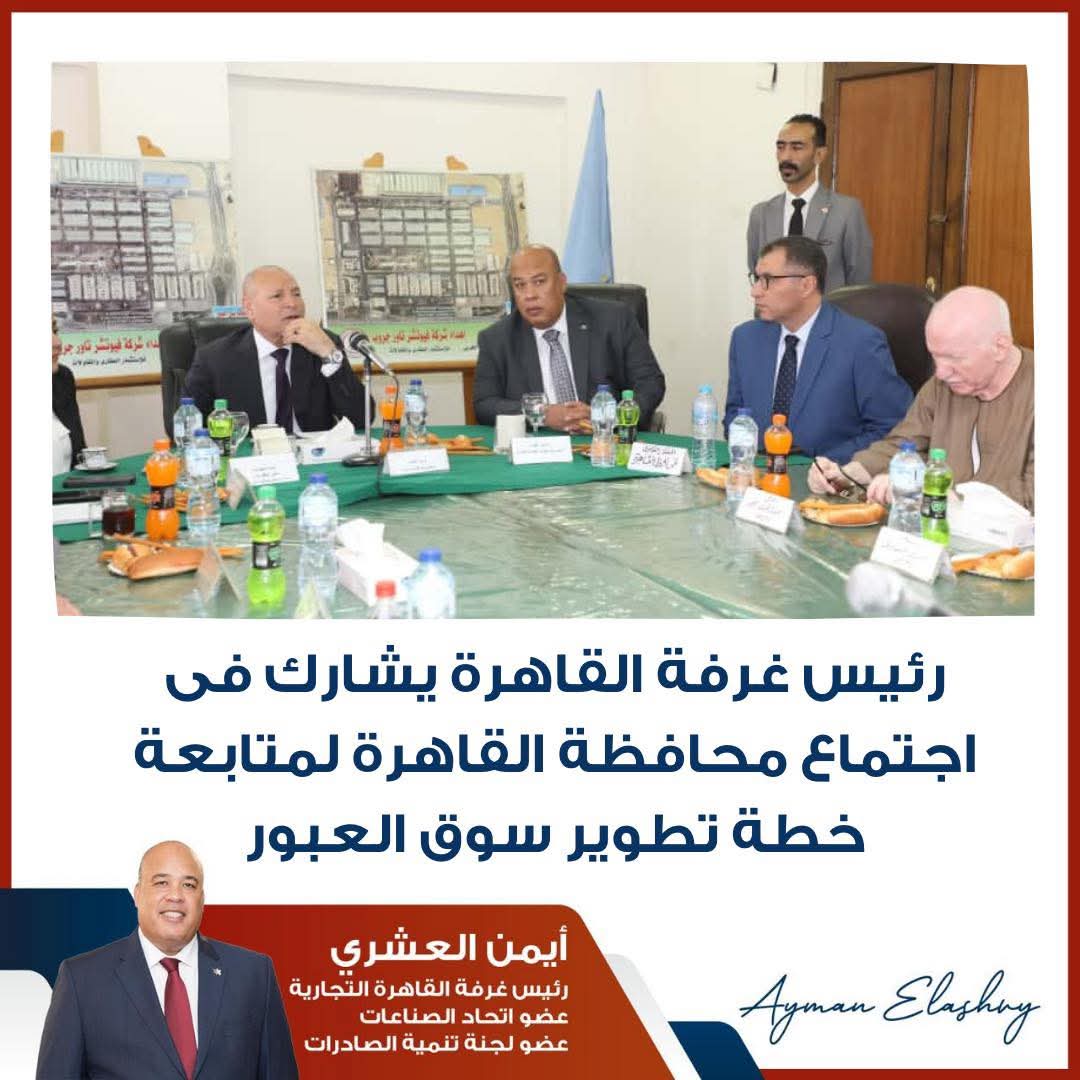كما شارك أيمن العشري رئيس غرفة العاصمة، في اجتماع مجلس إدارة سوق العبور، بدعوه من اللواء الدكتور إبراهيم صابر محافظ القاهرة، والذى خُصِّص لمتابعة خطة تطوير ورفع كفاءة السوق بما يعزز دوره الحيوي في توفير السلع الأساسية وضبط أسعار الخضر والفاكهة والأسماك.