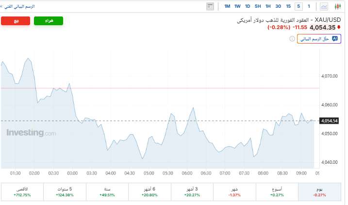 انخفضت الأسعار الفورية للذهب بنسبة 0.2% لتتداول حاليًا عند 4054 دولارًا للأوقية، بعدما افتتحت التداولات عند المستوى 4065 دولار، وسجلت أدنى مستوى عند 4,040 دولارًا وأعلى مستوى عند 4,077 دولارًا، بحسب تقرير موقع «إنفيستينج».