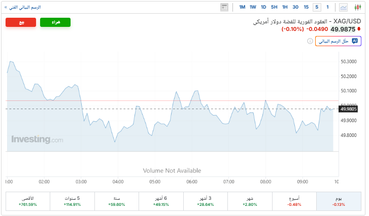 أما على الصعيد العالمي، انخفضت العقود الفورية للفضة في جلسة بداية تداولات الأسبوع بشكل طفيف بنسبة 0.1%، لتسجل 49.98 دولار للأوقية، بعد أن افتتحت التداولات عند المستوى 50.03 دولار، وفقًا لـ«إنفستينج».