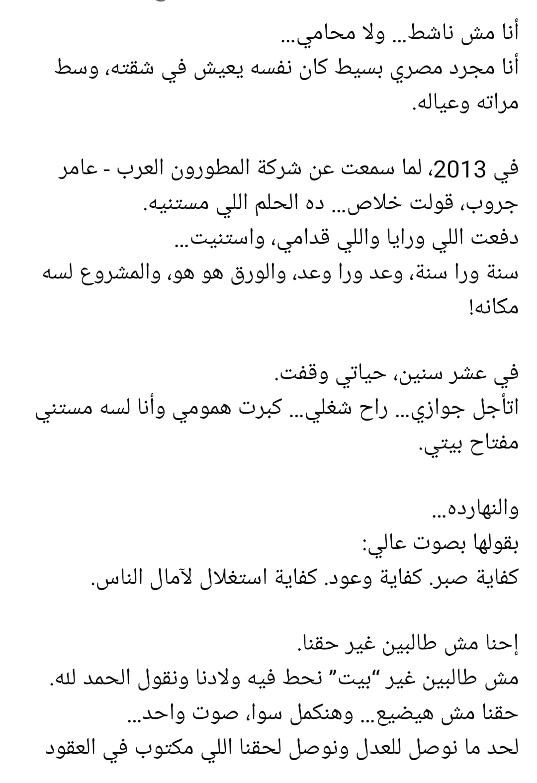 وتداول عملاء آخرون شهادات أخرى، حيث قال أحد المتضررين إنه لم يكن ناشطًا أو صاحب صفة قانونية، بل مجرد مواطن مصري كان يحلم بشقة يجمع فيها أسرته.