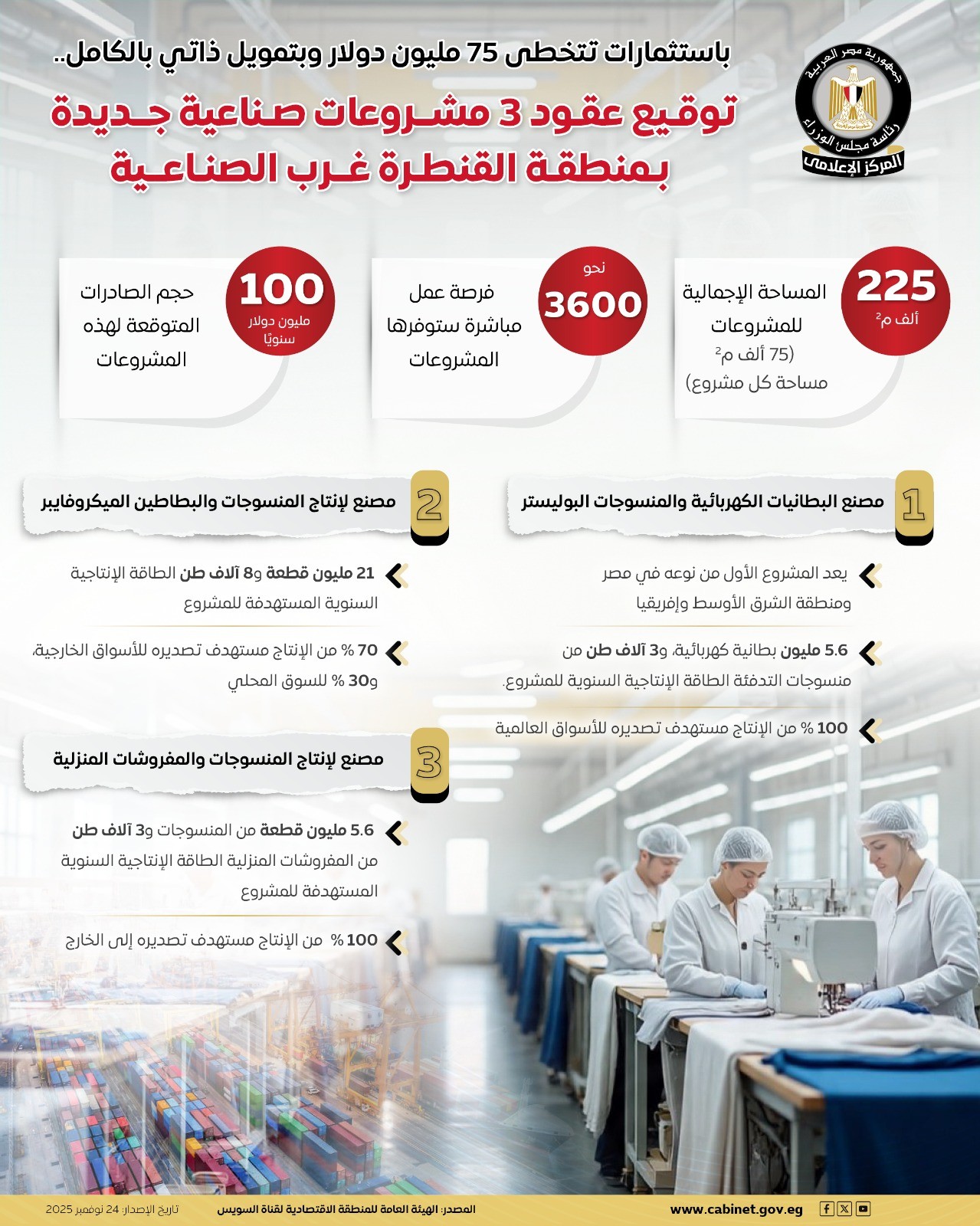 وتوفر تلك المشروعات، نحو 3,600 فرصة عمل مباشرة ستوفرها المشروعات الثلاثة في القنطرة غرب الصناعية، كما يتوقع وصول حجم الصادرات إلى 100 مليون دولار سنويًا.
