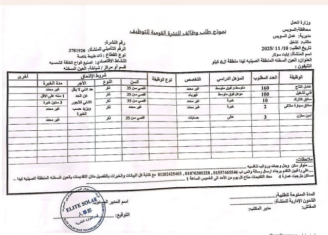 أعلنت وزارة العمل اليوم، توفير 275 فرصة عمل جديدة لأبناء محافظة السويس، للعمل بشركة “إيليت سولار” العاملة في مجال الصناعات والتقنيات المرتبطة بالطاقة، في إطار تنفيذ توجيهات وزير العمل محمد جبران بتوفير فرص عمل لائقة للشباب، وتعزيز فرص التشغيل داخل المشروعات الصناعية.