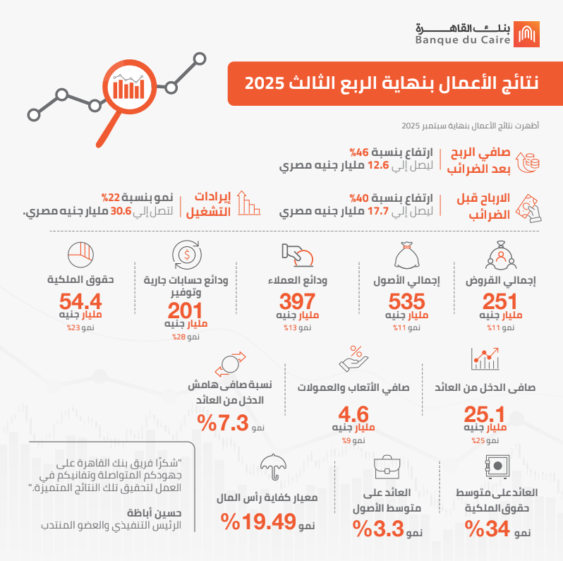 وارتفعت الأرباح قبل الضرائب لبنك القاهرة بنهاية سبتمبر 2025، بنسبة 40% مدفوعة بتحسن نتائج أعمال البنك في مختلف القطاعات ومن أبرزها التجزئة المصرفية، الخزانة، ائتمان الشركات، والمشروعات الصغيرة والمتوسطة.