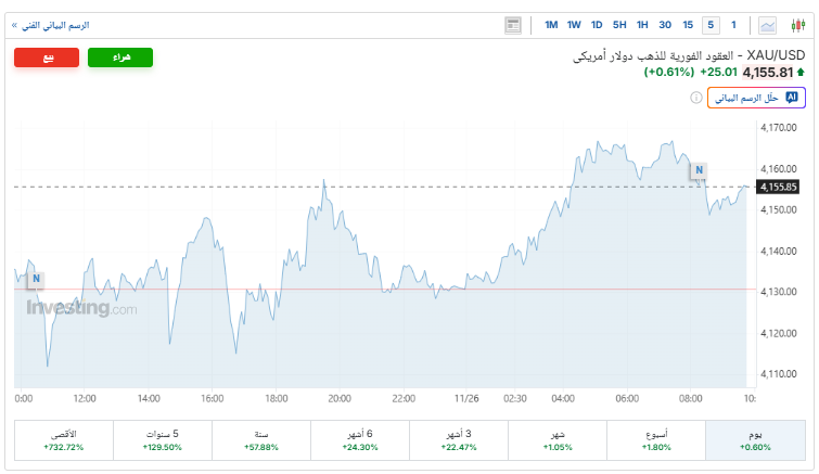 وارتفعت الأسعار الفورية للذهب بنسبة 0.6%، لتتداول حاليًا عند 4,155 دولارًا للأوقية، بعدما افتتحت التداولات عند المستوى 4,130 دولارًا، فيما سجلت أدنى مستوى عند 4,129 دولارًا وأعلى مستوى عند 4,169 دولارًا، بحسب تقرير موقع «إنفيستينج».