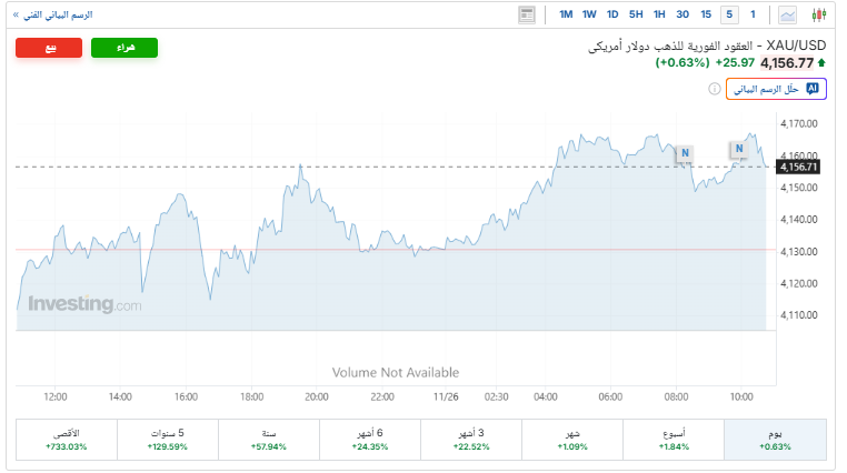 وارتفعت الأسعار الفورية للذهب بنسبة 0.6%، لتتداول حاليًا عند 4,156 دولارًا للأوقية، بعدما افتتحت التداولات عند المستوى 4,130 دولارًا، فيما سجلت أدنى مستوى عند 4,129 دولارًا وأعلى مستوى عند 4,169 دولارًا، بحسب تقرير موقع «إنفيستينج».