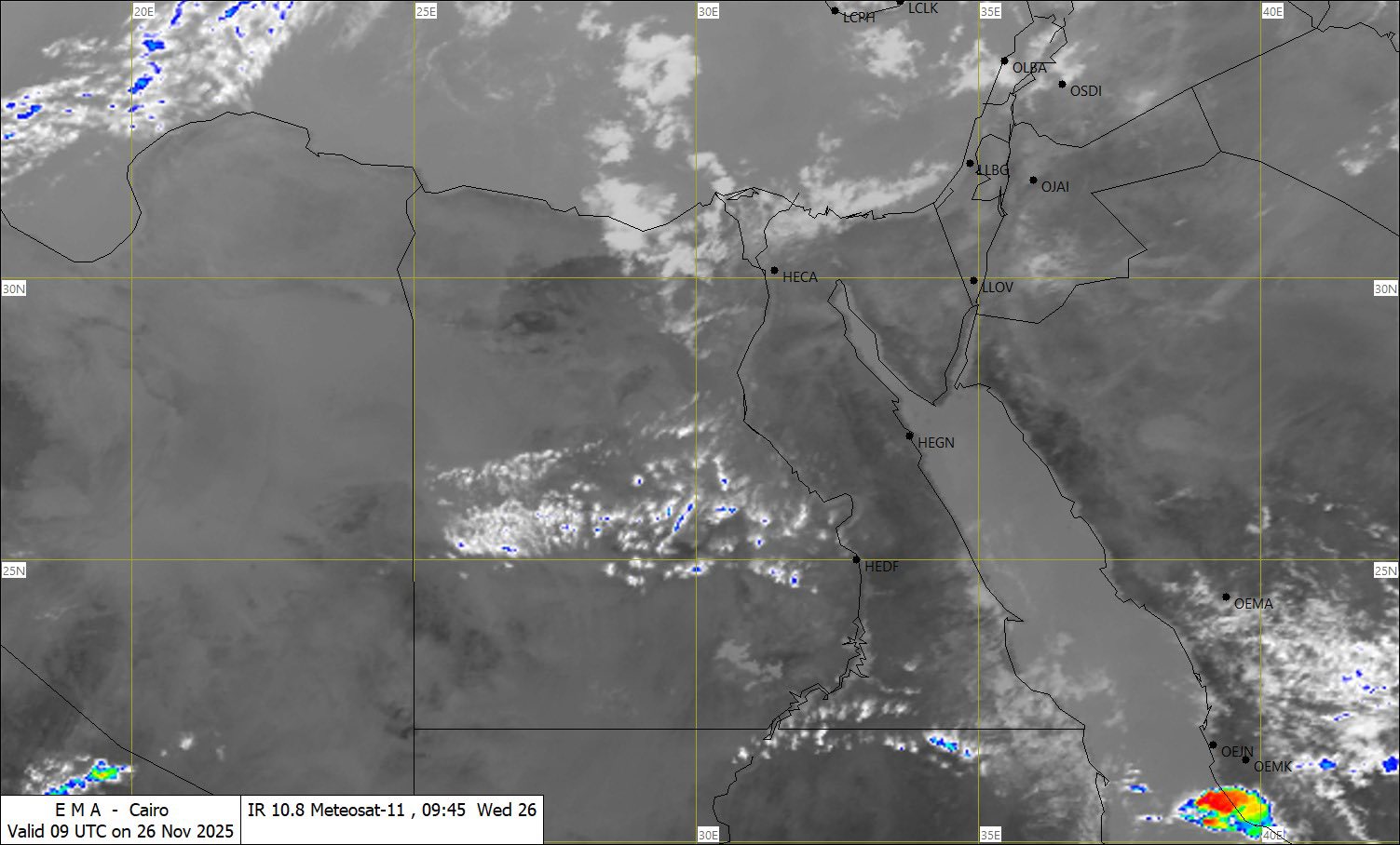 كشفت هيئة الأرصاد الجوية، عن آخر صور الأقمار الصناعية لتشير إلى تدفق السحب المنخفضة والمتوسطة على مناطق من السواحل الشمالية وشمال الوجه البحري، موضحة أن طقس اليوم قد يصاحبه سقوط أمطار خفيفة على مناطق متفرقة، منوهة في الوقت ذاته أن درجة الحرارة الآن على القاهرة الكبرى 22 درجة مئوية.