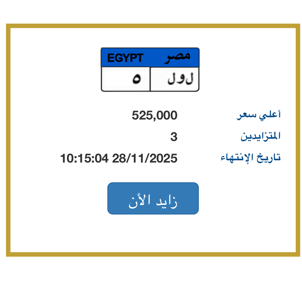 شهد مزاد اللوحات الإلكترونية التابع للإدارة العامة للمرور، منافسة قوية على اقتناء اللوحة المميزة «ل و ل 5»، حيث ارتفع سعرها بشكل ملحوظٍ ليصل إلى 525 ألف جنيه بعد تنافس بين ثلاثة متزايدين على شرائها، ويشهد المزاد الإلكتروني، إقبالًا متزايدًا من المواطنين الراغبين في اقتناء لوحات ذات طابع خاص، تحمل حروفًا وأرقامًا مميزة، حيث أن العائد من هذه المزادات، يُخصص لدعم صندوق تحيا مصر.