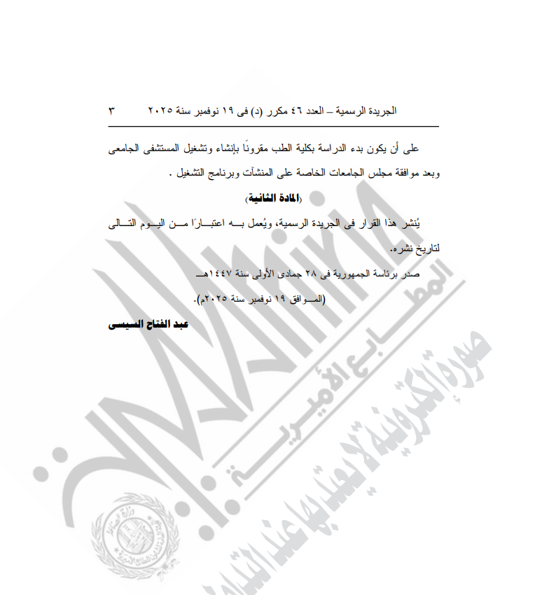 الجريدة الرسمية تنشر قرارا جمهوريا بـإضافة الطب والصيدلة لـ جامعة اللوتس