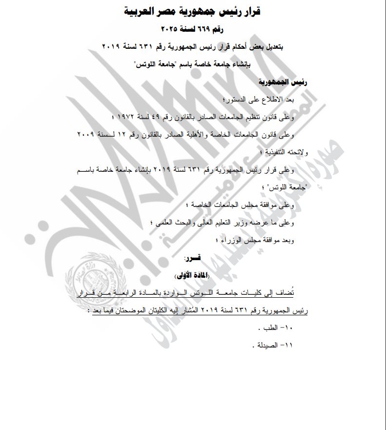 أصدر الرئيس عبدالفتاح السيسي قرار رقم 669 لسنة 2025، نصت مادته الأولي على أن تضاف إلى كليات جامعة اللوتس الواردة بالمادة الرابعة من قرار رئيس الجمهورية رقم 631 لسنة 2019، كليتان الطب والصيدلة.