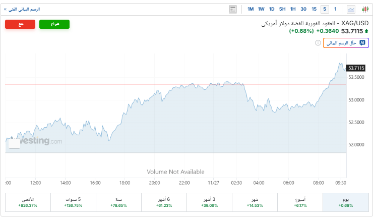 أما على الصعيد العالمي، فقد ارتفعت العقود الفورية للفضة في بداية تداولات اليوم بشكل طفيف بنسبة 1.2%، لتسجل 53.711 دولار للأوقية، بعد أن افتتحت التداولات عند المستوى 53.34 دولار، وفقًا لـ«إنفستينج».