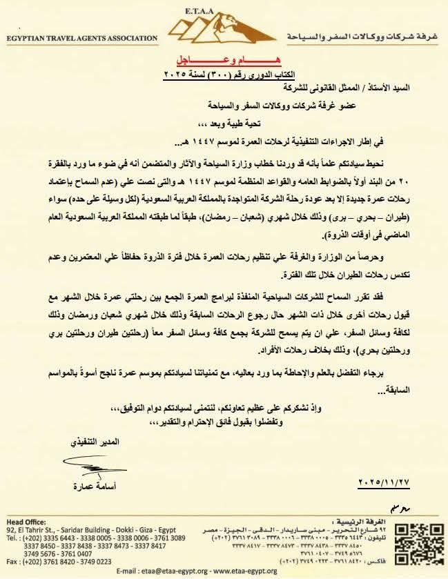 من جانبها عممت غرفة شركات السياحة، إخطارا على جموع الشركات، حصل "إيجي إن" على نسخة منه، بالسماح للشركات السياحية المنفذة لبرامج العمرة الجمع بين رحلتي عمرة خلال الشهر مع قبول رحلات أخرى خلال ذات الشهر حال رجوع الرحلات السابقة، على أن يتم السماح للشركة بجمع كافة وسائل السفر معاً "رحلتين طيران ورحلتين بري ورحلتين بحرى"، وذلك بخلاف رحلات الأفراد.
