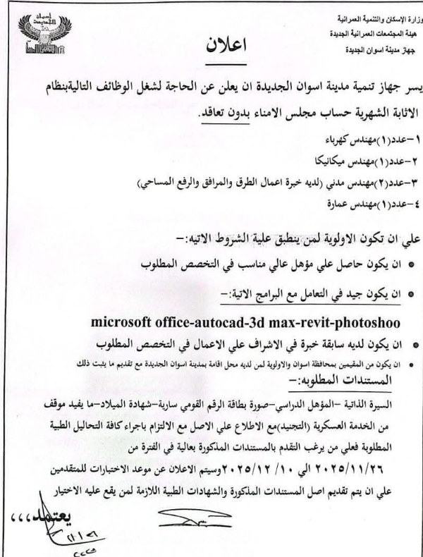 أعلن جهاز تنمية مدينة أسوان الجديدة، التابع لوزارة الإسكان والتنمية العمرانية، عن فتح باب التقديم لشغل عدد من الوظائف الهندسية بنظام الإثابة الشهرية عبر حساب مجلس الأمناء، دون تعاقد مباشر.