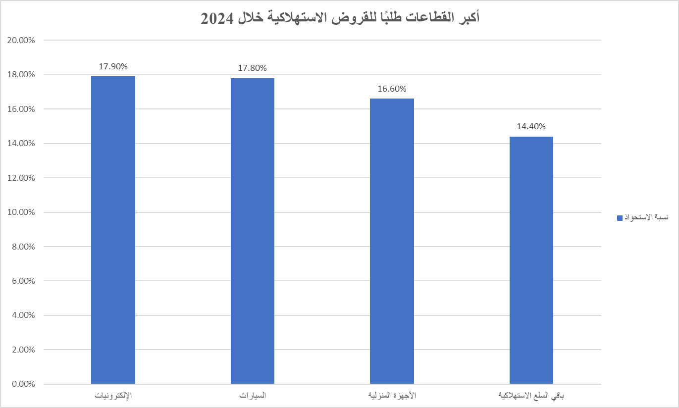وكانت أكثر القطاعات طلبًا لهذه القروض خلال 2024، هي قطاع الإلكترونيات، مستحوذة على 17.9% من إجمالي هذه القروض، تلتها قطاع السيارات والمركبات بنسبة 17.8%، ثم الأجهزة الكهربائية والمنزلية بنسبة 16.6%، أما باقي السلع الاستهلاكية فاستحوذت على 14.4%.