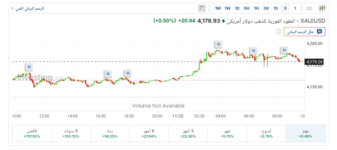 وارتفعت الأسعار الفورية للذهب بنسبة 0.5%، لتتداول حاليًا عند 4,178 دولارًا للأوقية، بعدما افتتحت التداولات عند 4,157 دولارًا، فيما سجلت أدنى مستوى عند 4,193 دولارًا وأعلى مستوى عند 4,169 دولارًا، بحسب تقرير موقع «إنفيستينج».