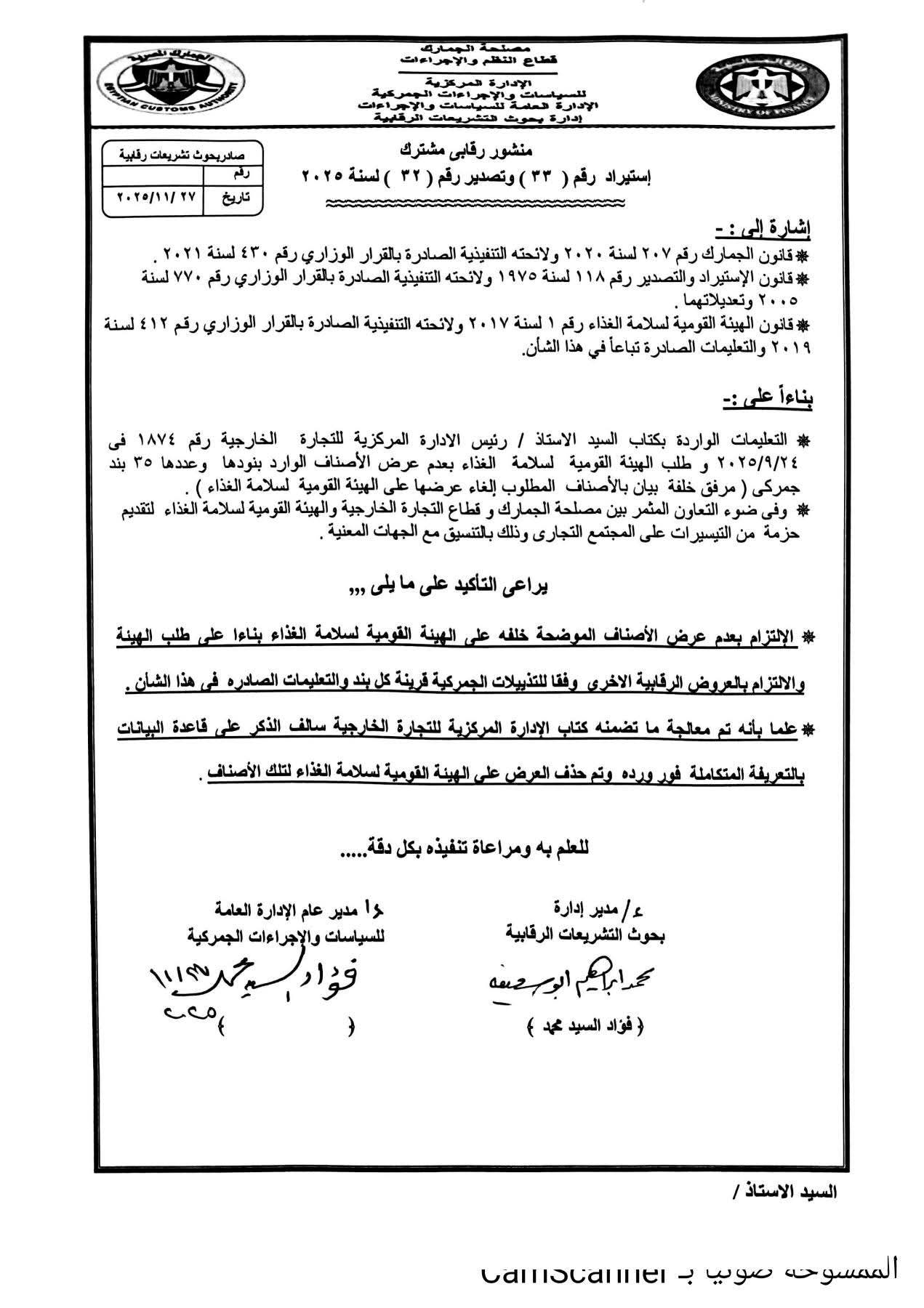 أصدرت مصلحة الجمارك المصرية منشورًا رقابيًا مشتركًا للاستيراد رقم (30) وللتصدير رقم (32) لسنة 2025، تضمن التأكيد على استبعاد عدد من الأصناف من العرض على الهيئة القومية لسلامة الغذاء، وذلك بناءً على طلب الهيئة، مع الالتزام بالمسارات الرقابية الأخرى المعمول بها وفق التذييلات الجمركية.