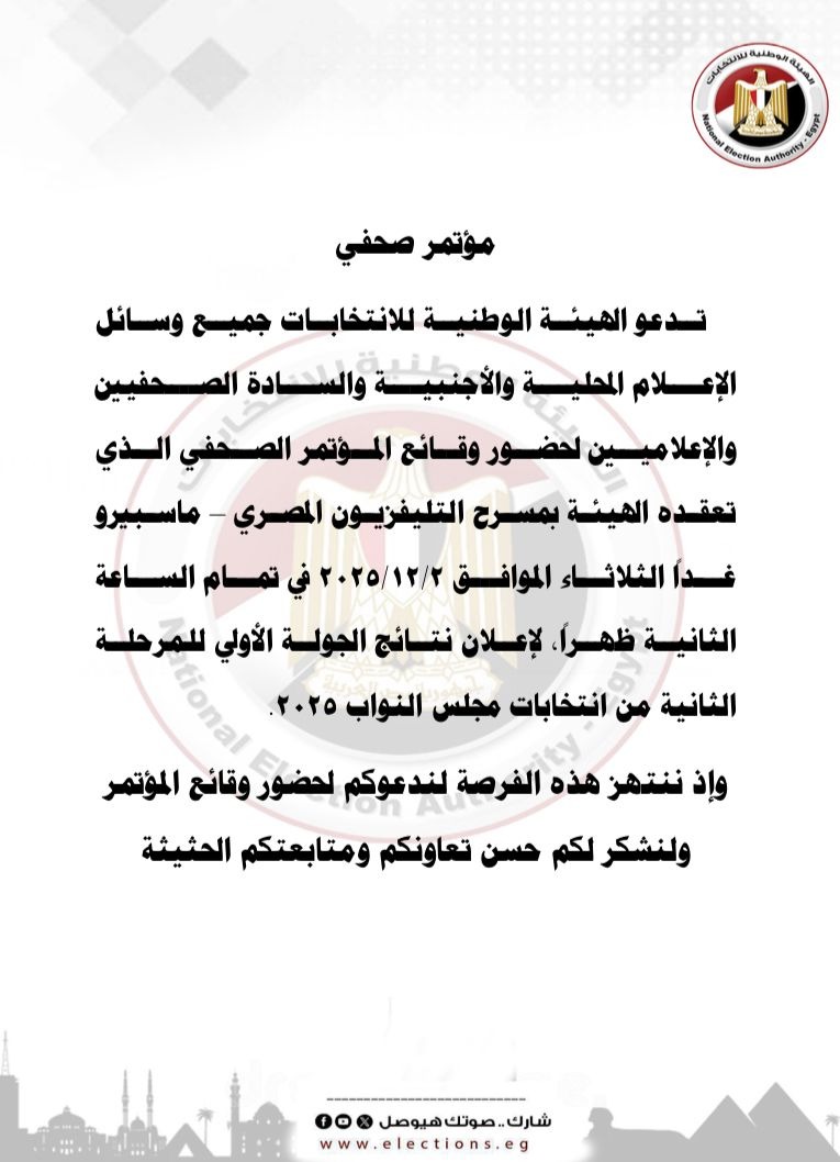 ودعت الهيئة الوطنية للانتخابات جميع وسائل الإعلام المحلية والأجنبية والصحفيين والإعلاميين لحضور وقائع المؤتمر الصحفي الذي يعقد في الثانية ظهر غد الثلاثاء من أجل إعلان نتائج الجولة الأولى للمرحلة الثانية من انتخابات مجلس النواب.