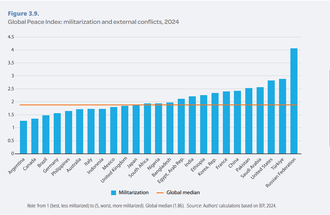 ويعتمد المؤشر السابق على اتجاهين، هما مدى القوة العسكرية الداخلية للدولة، وحجم التوتر أو الاستقرار مع الدول المجاورة، بمعنى مدى النزاعات الخارجية التي تواجهها الدولة، أي أن المؤشر يجمع بين قياس قوة تسليح الدولة و سلوكها الخارجي، وكيفية استخدام الدول لجيشها وتأثيره على السلام في المنطقة والعالم.