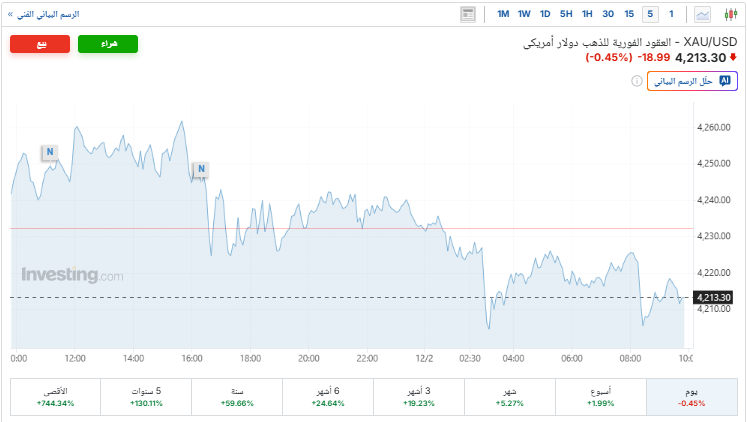 تراجع سعر الذهب خلال تعاملات اليوم الثلاثاء 2 ديسمبر 2025، بعد أن سجل أعلى مستوى له في ستة أسابيع خلال جلسة أمس، متأثرًا بحركة جني أرباح من المستثمرين، وفي وقت يترقب فيه السوق تصريحات رئيس الاحتياطي الفيدرالي وصدور بيانات اقتصادية قد تعزز توقعات خفض الفائدة.