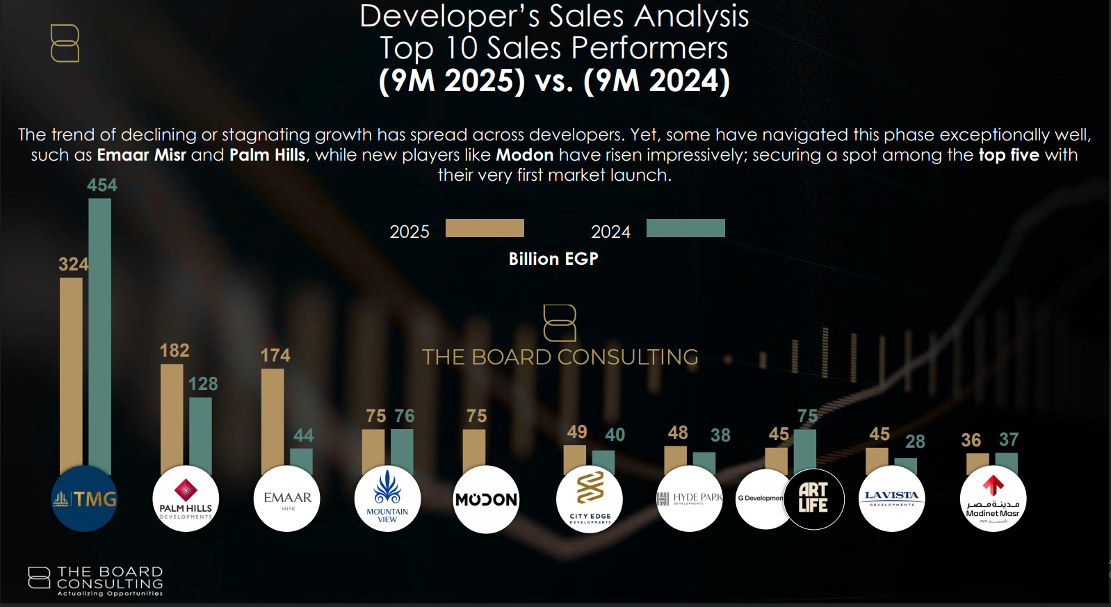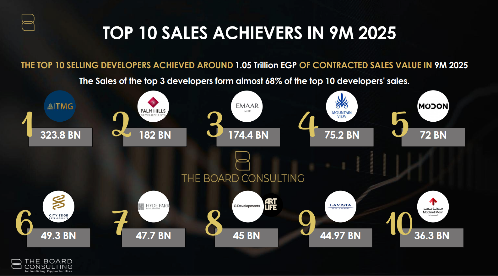 وأظهر التقرير سيطرة المطورين الثلاثة الأوائل على المشهد، مستحوذين على نحو 680.2 مليار جنيه من إجمالي المبيعات خلال 9 أشهر، أي حوالي 68% من مبيعات أكبر 10 مطورين، حيث تصدرت مجموعة طلعت مصطفى القابضة (TMG) القائمة بقيمة 323.8 مليار جنيه مقابل 454 مليار جنيه، تلتها بالم هيلز للتعمير بقيمة 182 مليار جنيه مقابل 128 مليار جنيه، ثم إعمار مصر بقيمة 174.4 مليار جنيه مقابل 44 مليار جنيه.