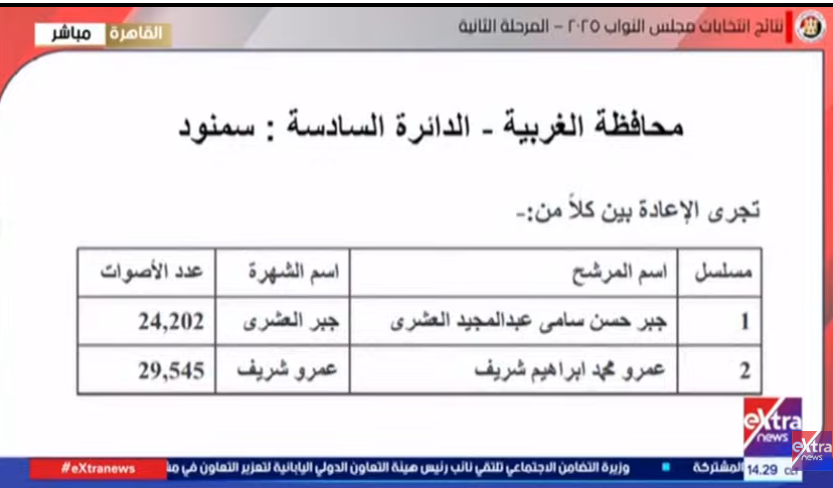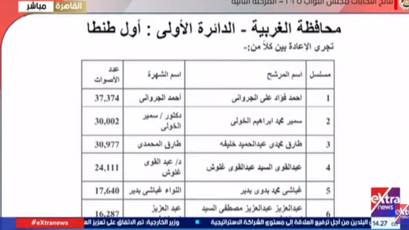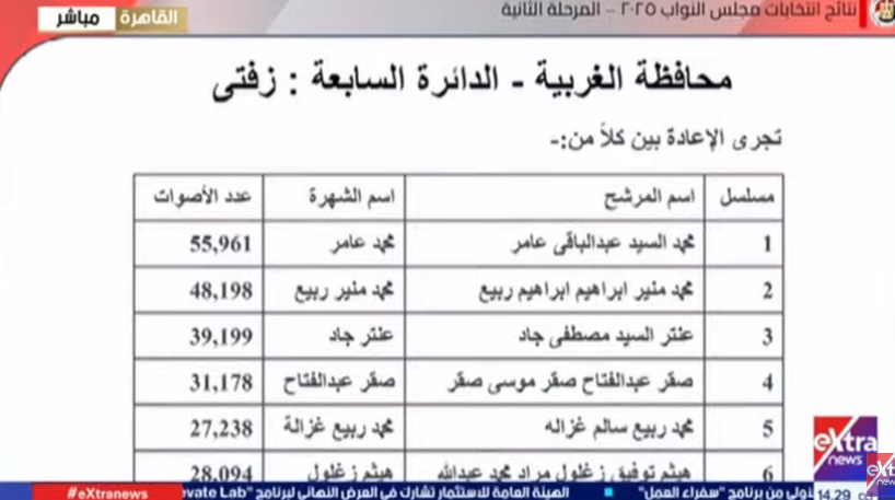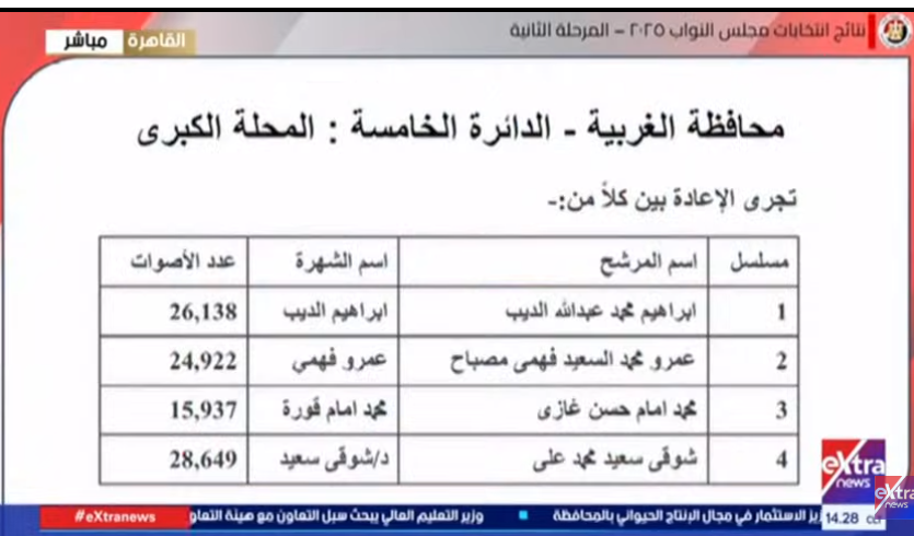 وتجرى الإعادة في الدائرة الخامسة قسم المحلة الكبرى، بين كلاً من: ابراهيم محمد عبدالله لبيب، وعمرو محمد السعيد فهمي مصباح، ومحمد إمام حسن غازي، وشوقي سعيد محمد علي.