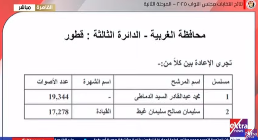 تجرى الإعادة في الدائرة الثالثة قطور بين كلاً من: محمد عبد القادر السيد الدماطي، وسليمان صالح سليمان غيط.