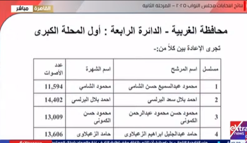 وأعلنت الهيئة إجراء جولة الإعادة في الدائرة الرابعة أول المحلة الكبرى، بين كلاً من: محمد عبد السميع حسن الشامي، وأحمد بلال سعد البرلسي، ومحمود حسن محمود الكموني، وحامد عبد الجليل ابراهيم الزعبلاوي.