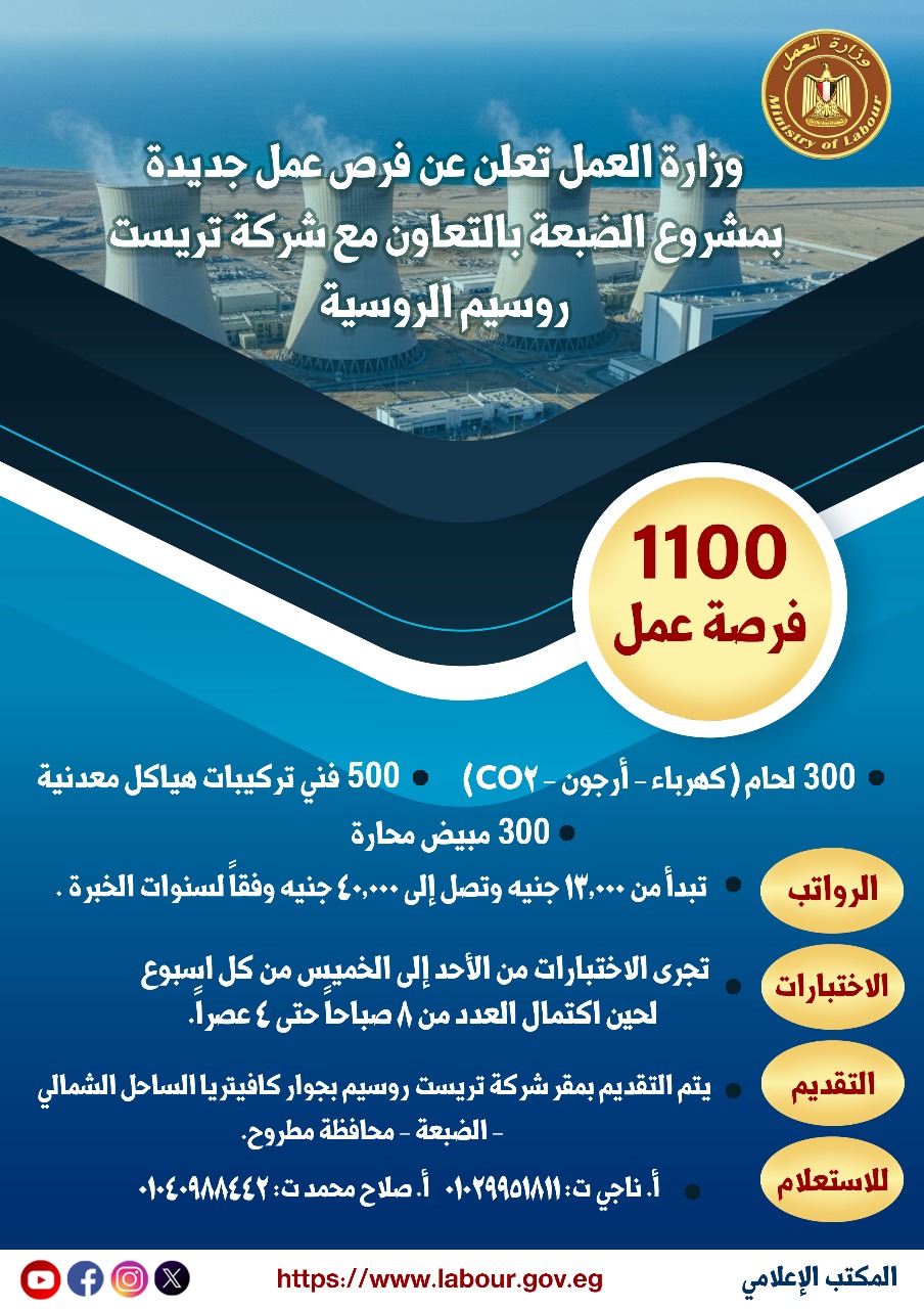 أعلنت وزارة العمل، إتاحة مجموعة من الوظائف الفنية الجديدة بالتعاون مع شركة تريست روسيم، إحدى الشركات المنفذة لأعمال الإنشاءات داخل محطة الضبعة النووية، في إطار توجيهات محمد جبران، وزير العمل، بتوفير فرص عمل لائقة للشباب ورفع معدلات التشغيل بالمشروعات القومية.