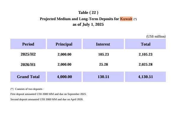وأشار التقرير إلى أنه لدى البنك المركزي المصري حاليًا، وديعتين من الكويت بقيمة إجمالية أربعة مليارات دولار، وكان من المقرر استحقاق إحداهما بملياري دولار في سبتمبر الماضي، بينما تمتد مدة الوديعة الثانية، حتى أبريل 2026 بنفس القيمة.