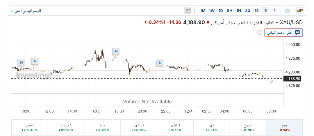 وتراجعت الأسعار الفورية للذهب بشكل طفيف، خلال جلسة تداولات اليوم بنسبة 0.3% لتتداول حاليًا عند 4,188 دولارًا للأوقية، بعد أن حققت مكاسب ملحوظة في بداية الأسبوع، بحسب موقع «إنفيستينج».