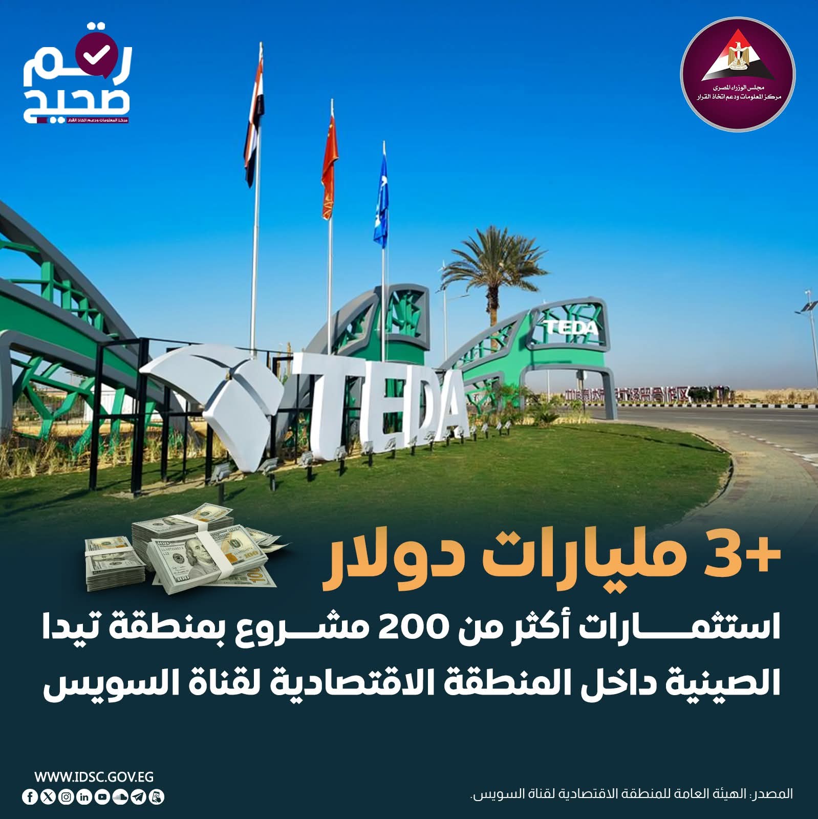 شهدت المنطقة الاقتصادية لقناة السويس توسعًا ملحوظًا في حجم التعاون مع منطقة تيدا الصينية، إحدى أكبر المطورين الصناعيين العاملين داخل المنطقة، حيث ارتفع عدد المشروعات الصناعية والخدمية واللوجستية إلى أكثر من 200 مشروع بإجمالي استثمارات تتخطى 3 مليارات دولار.
