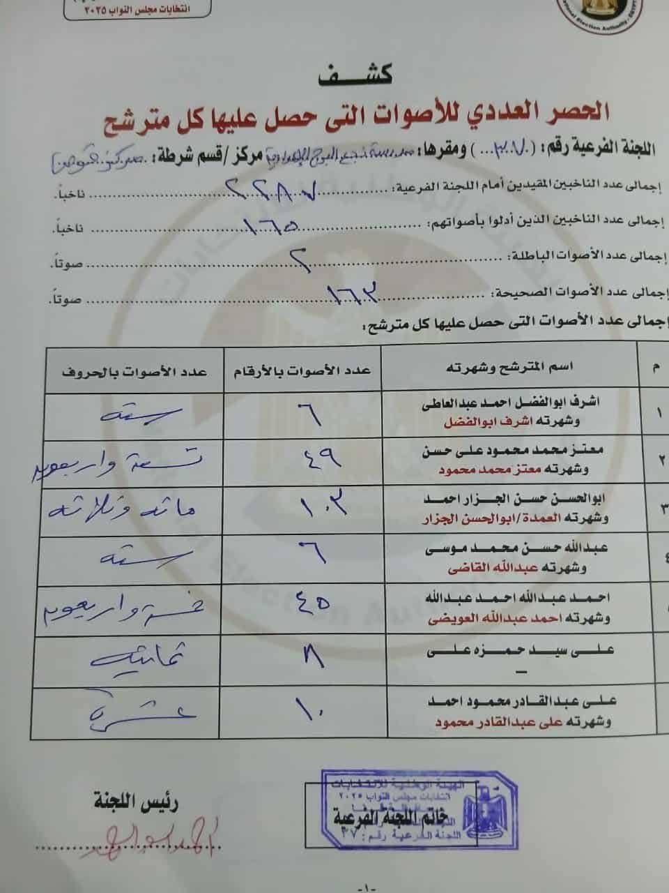 كشفت عملية الحصر العددي للأصوات في اللجنة الفرعية رقم 37 ومقرها مدرسة نجع البرج الإعدادية بمركز شرطة قوص، عن نتائج لافتة وغير مسبوقة في انتخابات مجلس النواب 2025.