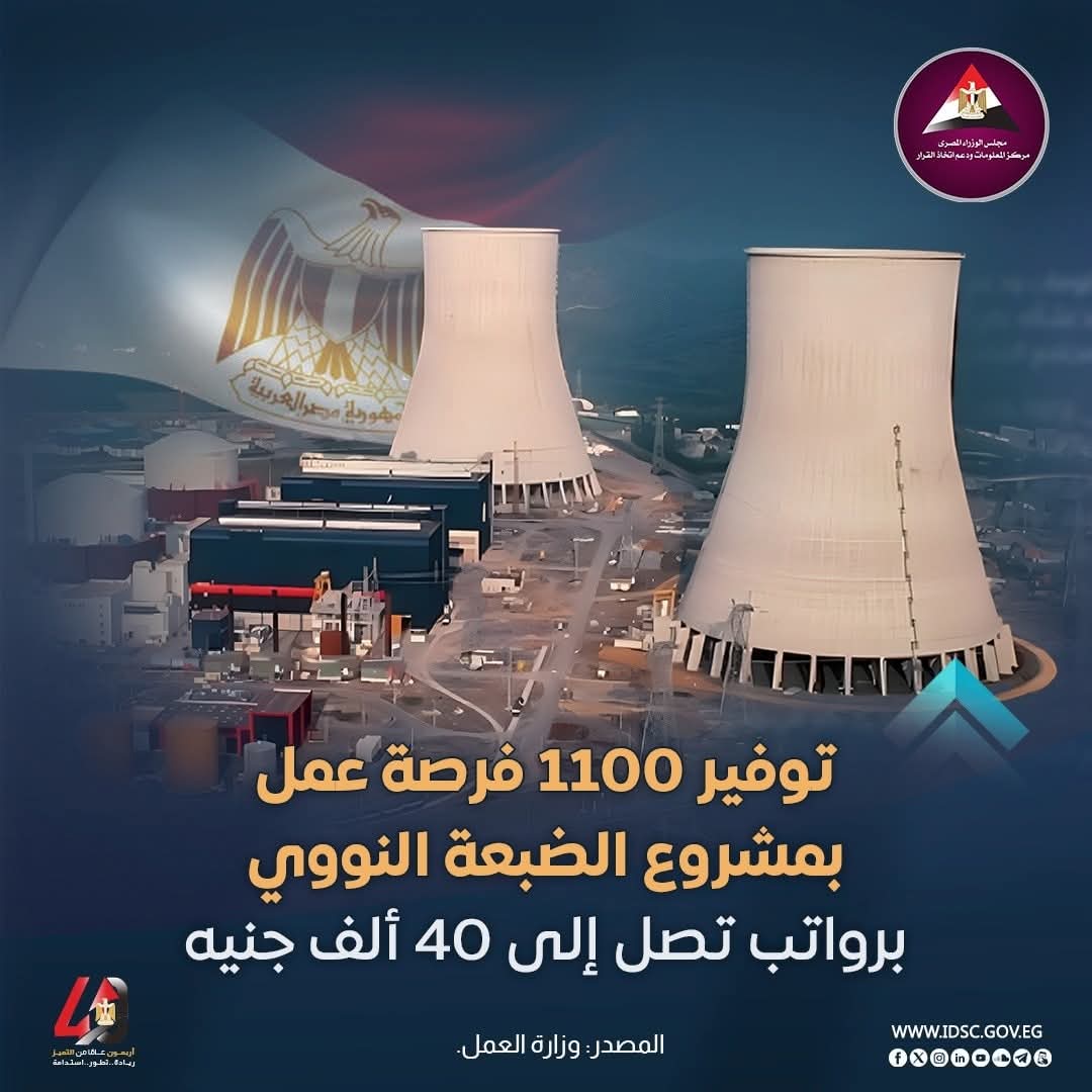 أعلنت وزارة العمل عن طرح 1100 فرصة عمل فنية جديدة داخل مشروع محطة الضبعة النووية، وذلك بالتنسيق مع شركة تريست روسيم المسؤولة عن تنفيذ أعمال الإنشاءات بالموقع.