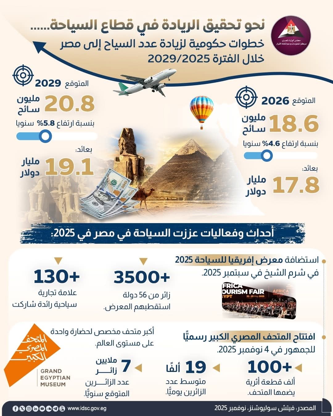 وتستهدف الحكومة رفع أعداد السياح القادمين إلى مصر إلى 18.6 مليون سائح في 2026 بإيرادات تصل إلى 17.8 مليار دولار، وصولًا إلى 20.8 مليون سائح في 2029 بإيرادات قدرها 19.1 مليار دولار، مدفوعة بمعدلات نمو متوقعة تتراوح بين 4.6% و5.8% سنويًا.