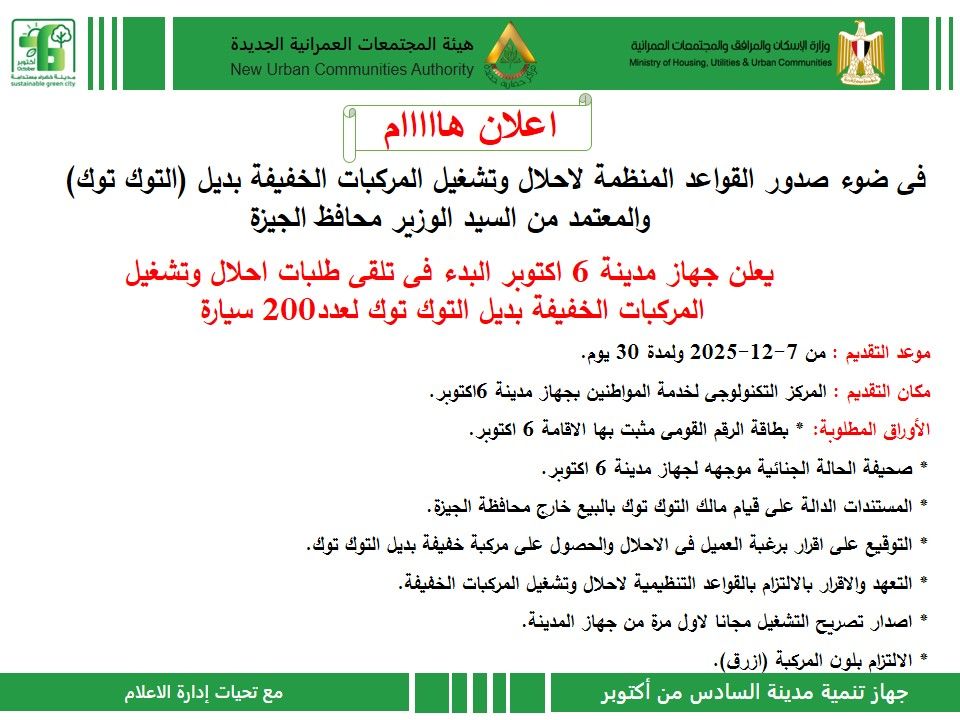 جهاز مدينة 6 أكتوبر يعلن تلقي طلبات إحلال وتشغيل المركبات بديل التوك توك