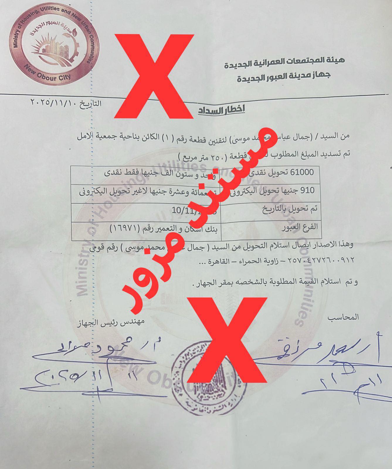 جهاز تنمية مدينة العبور الجديدة يحذر من تداول مستندات مزوّرة منسوبة له