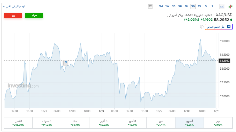 الفضة تحقق مكاسب أسبوعية 3.3% وتصل لـ 58.29 دولار للأوقية
