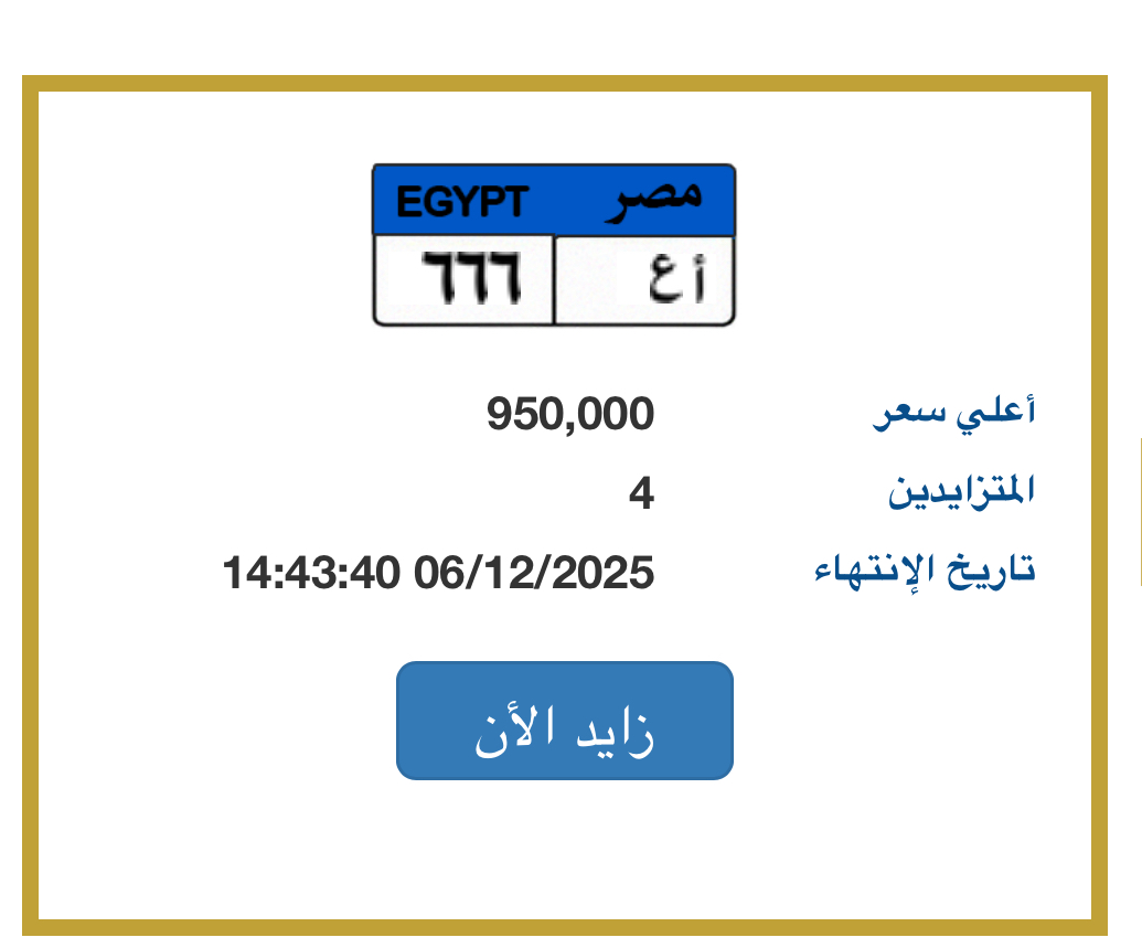 شهدت المنصة الحكومية لبيع لوحات المركبات المميزة ارتفاعًا كبيرًا في المزاد المقام على اللوحة «أ ع 666»، حيث قفز سعرها إلى 950 ألف جنيه وسط منافسة قوية بين 4 متزايدين يسعون لحسم المزاد قبل إغلاقه.
