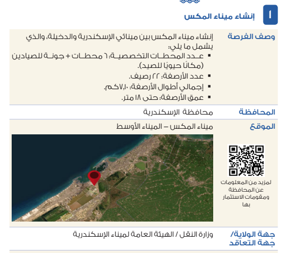 تتضمن أبرز الفرص إنشاء ميناء المكس بين مينائي الإسكندرية والدخيلة، ويشمل المشروع إقامة 6 محطات تخصصية بالإضافة إلى جونة للصيادين، مع تنفيذ 22 رصيفًا بإجمالي أطوال تصل إلى 7.1 كيلومتر وعمق يبلغ 18 مترًا.