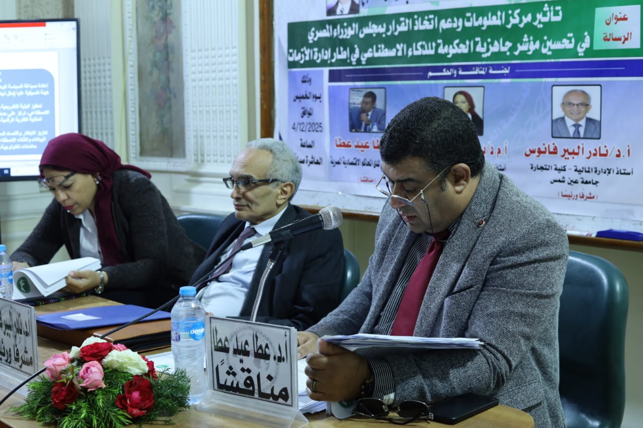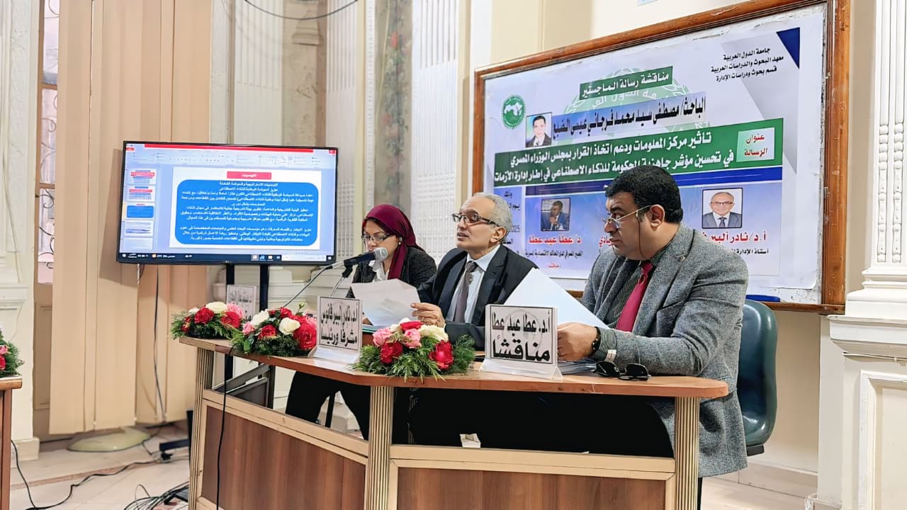 شهد معهد البحوث والدراسات العربية، قسم بحوث ودراسات الإدارة، مناقشة رسالة ماجستير للباحث مصطفى الضبع، تناولت واحدًا من أهم الموضوعات المرتبطة بمستقبل الإدارة الحكومية في مصر، بعنوان: “تأثير مركز المعلومات ودعم اتخاذ القرار بمجلس الوزراء المصري في تحسين مؤشر جاهزية الحكومة للذكاء الاصطناعي في إطار إدارة الأزمات”.