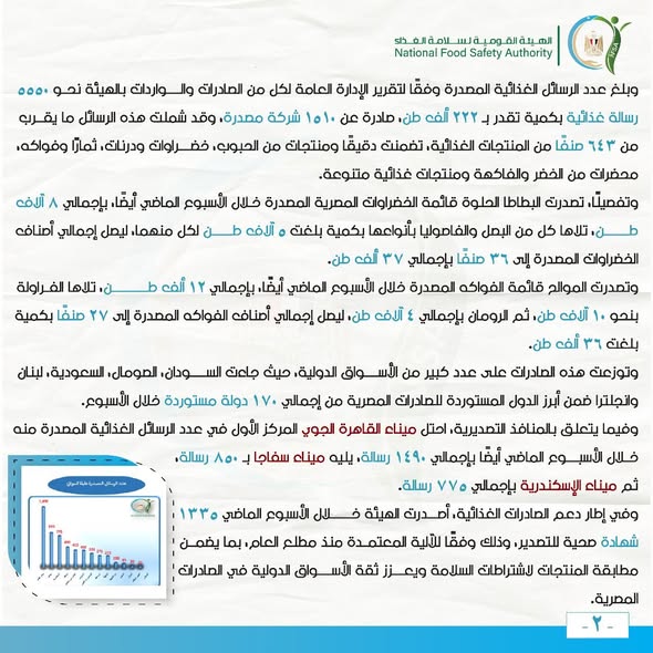 حجم الصادرات: بلغ عدد الرسائل الغذائية المصدرة 5550 رسالة بإجمالي كمية تُقدر بـ 222 ألف طن، صادرة عن 1510 شركة مصدرة، وشملت 643 صنفًا، منها دقيق ومنتجات حبوب وخضراوات وفواكه.