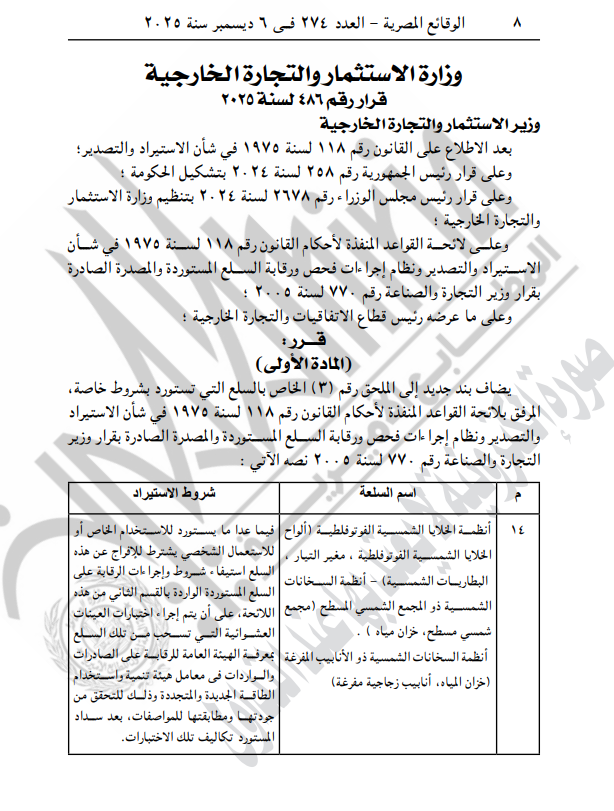 وتضمن القرار إضافة مجموعة من الأجهزة والمنتجات القائمة على الخلايا الشمسية ضمن السلع التي تخضع لشروط استيراد محددة، وتشمل أنظمة الخلايا الشمسية (ألواح الخلايا الشمسية، والبطاريات)، وأنظمة السخانات الشمسية ذات الأنابيب المفرغة.
