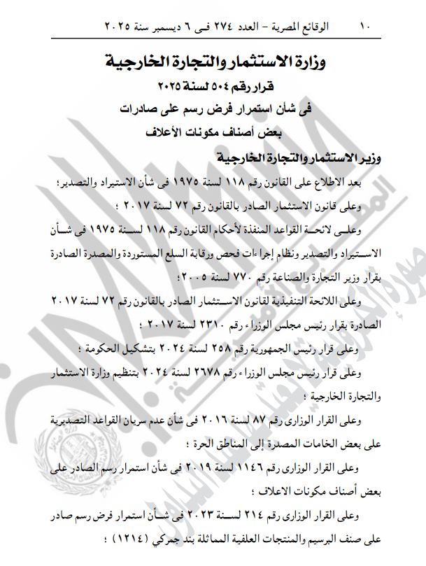نشرت الجريدة الرسمية في عددها رقم 274 الصادر بتاريخ 6 ديسمبر 2025، قرار وزير الاستثمار والتجارة الخارجية رقم 504 لسنة 2025، بشأن استمرار فرض رسم على صادرات بعض أصناف مكونات الأعلاف.