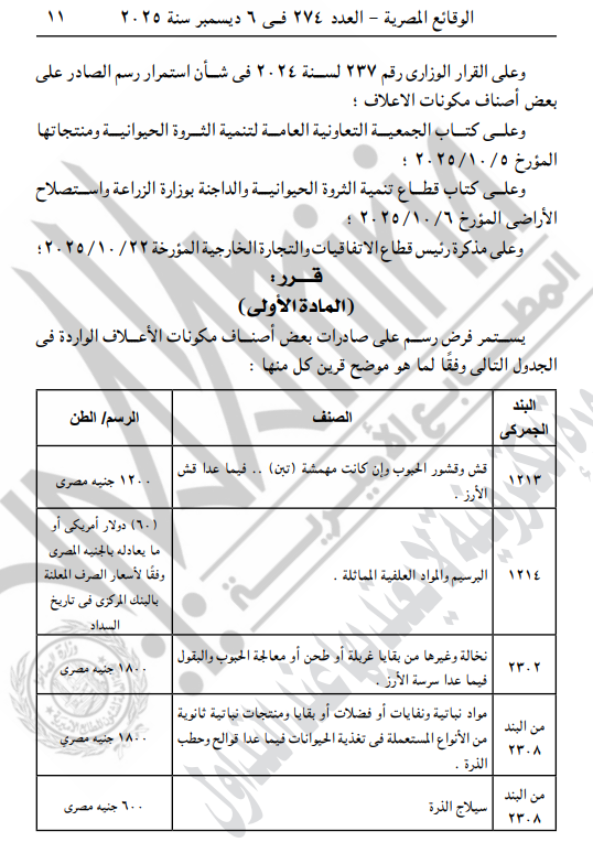 نص القرار على استمرار فرض رسم تصديري على عدد من أصناف مكونات الأعلاف الواردة، على النحو التالي: