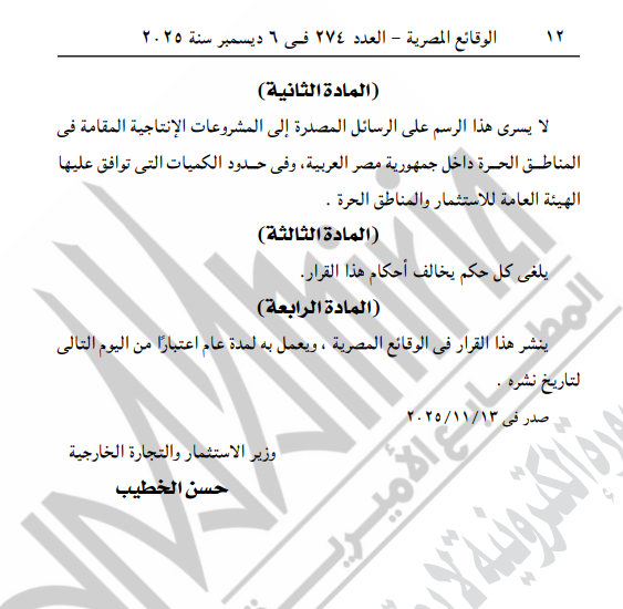كما نص القرار على نشره في الجريدة الرسمية والوقائع المصرية، ويعمل به لمدة عام اعتبارًا من اليوم التالي لتاريخ نشره.
